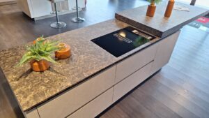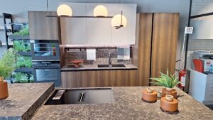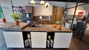 Il top è realizzato in pregiato materiale Emperador Brown, che si abbina perfettamente alle basi, e include uno zoccolo alto 12 cm. Un elemento distintivo di questa cucina è lo speciale piano scorrevole Orizon, che aggiunge versatilità e un tocco di design innovativo.